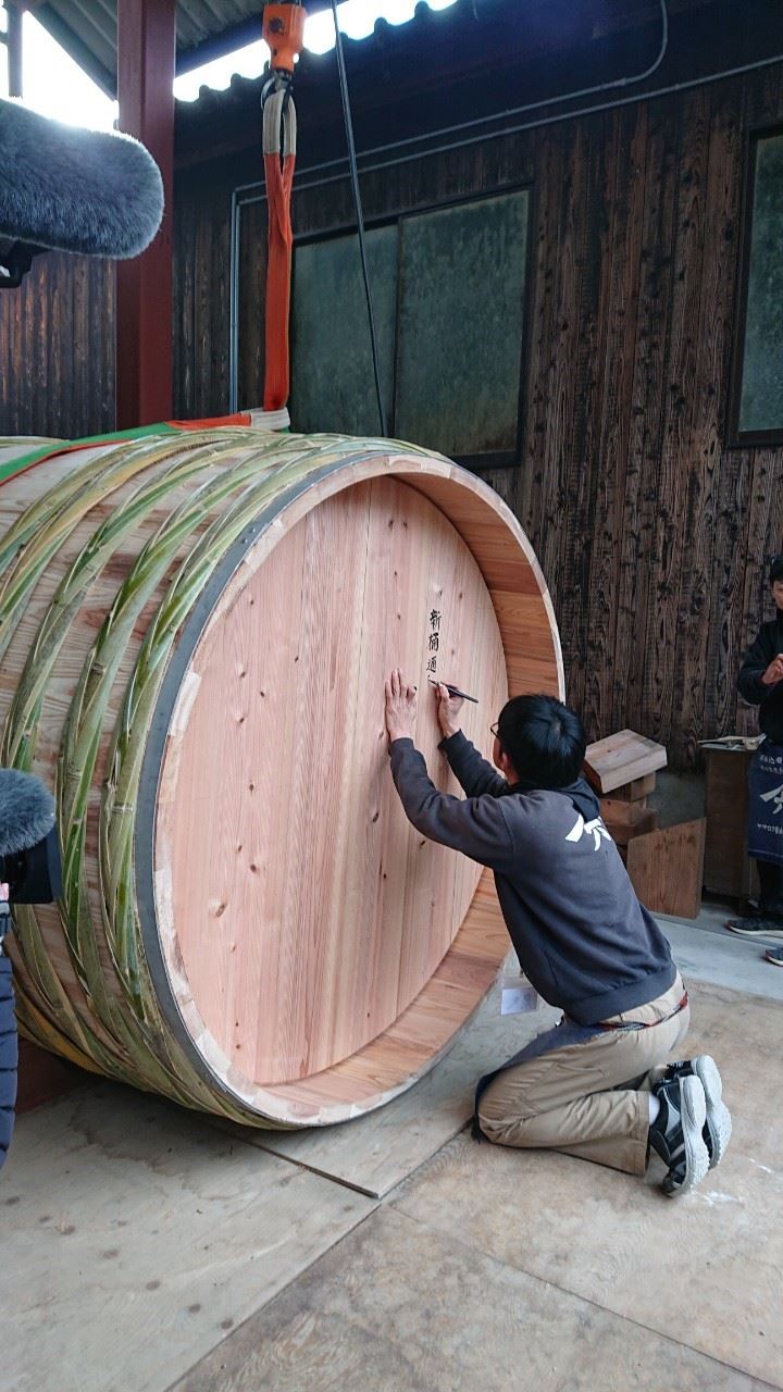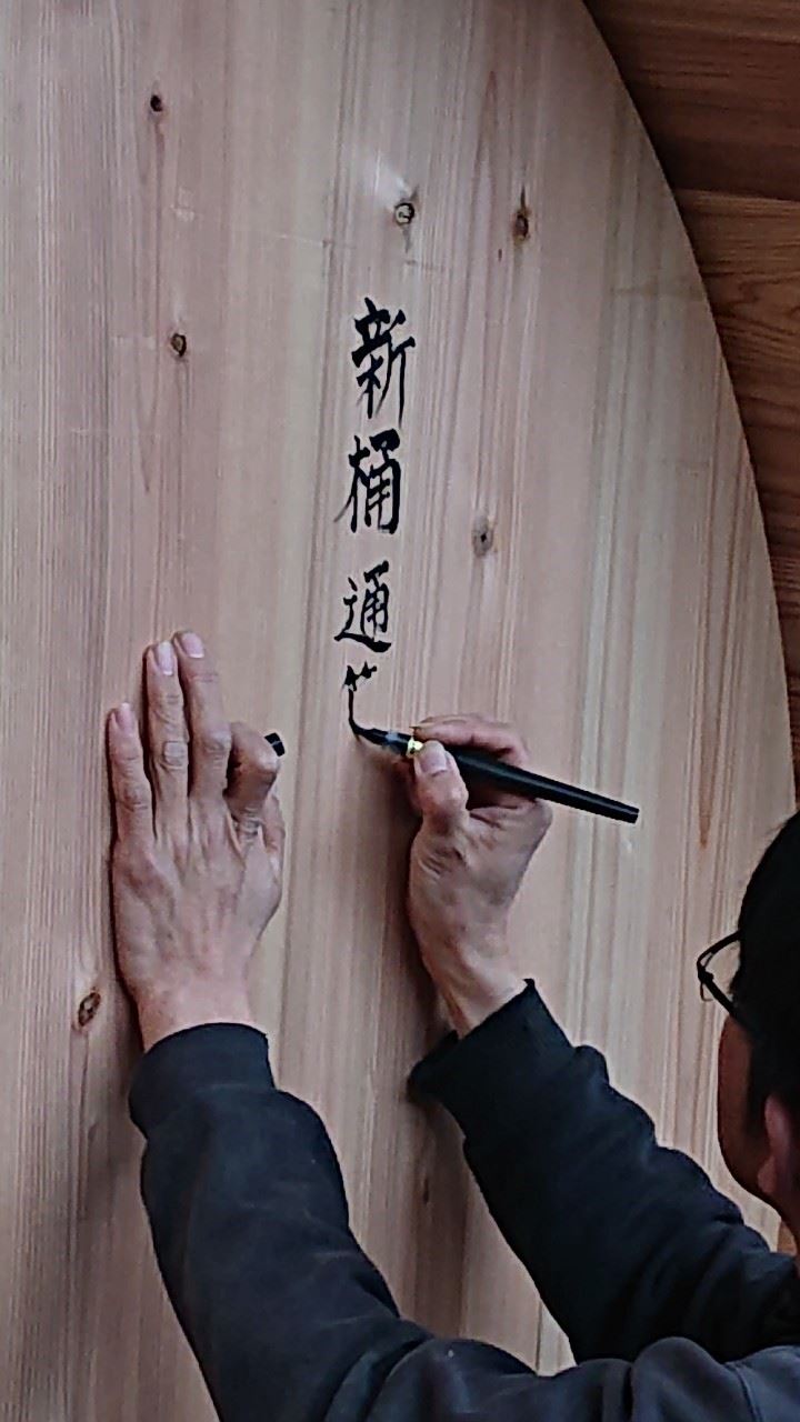 出来上がった木桶の底に、ヤマロク醤油五代目山本氏が筆入れします。